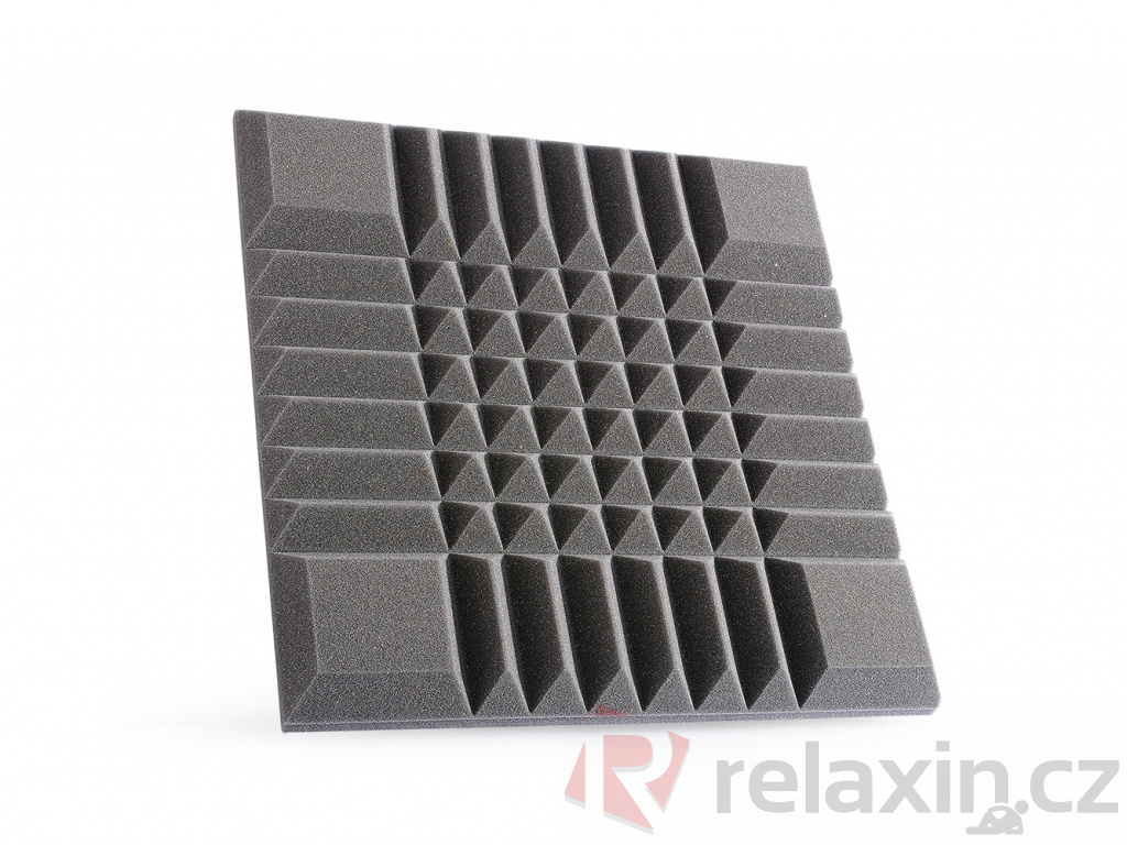 Samolepící skustická pěna jehlan (pyramidy) v rozměru 50x50x5 cm v grafitové barvě pro pohlcení zvuku v interiéru. 2 varianty požárního provedení =...