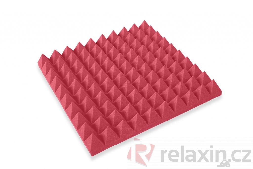 Akustická pěna jehlan v rozměrech 50x50x5 cm nebo 116x197x5 cm v červené barvě pro pohlcení zvuku v interiéru.