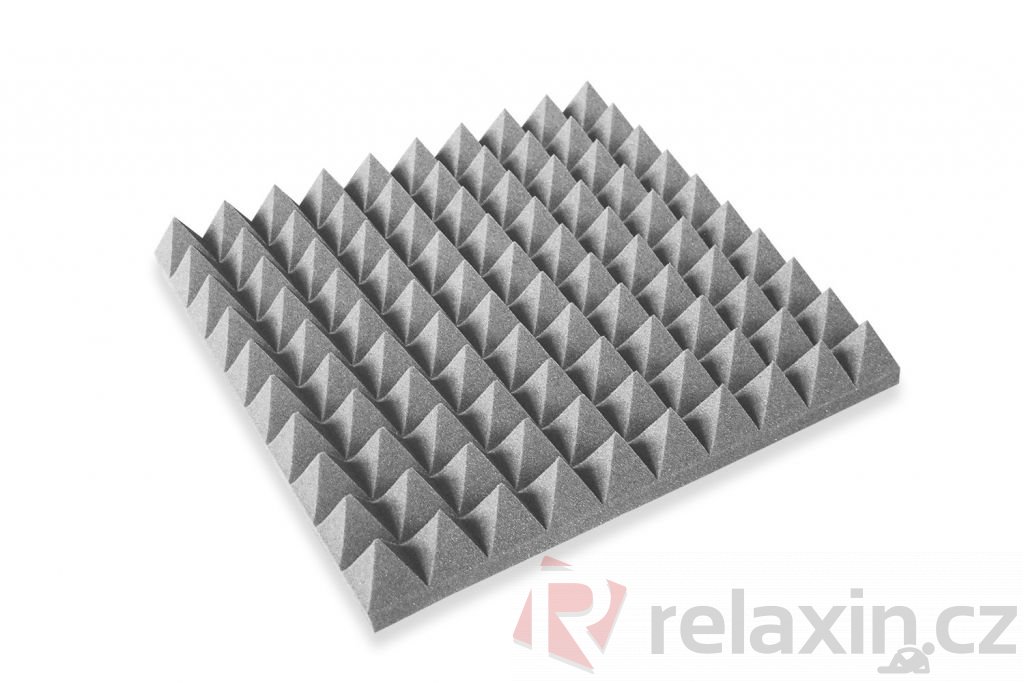 Akustická pěna jehlan v rozměrech 50x50x5 cm nebo 116x197x5 cm v šedé barvě pro pohlcení zvuku v interiéru.