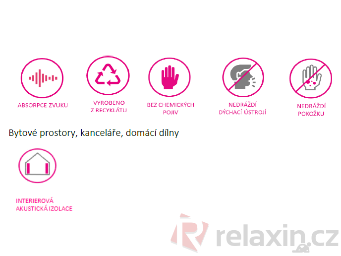 Samonosný akustický absorber k pohlcení / absorpci zvuku v bytových prostorách, zvukových studií, kanceláří, call centrech nebo domácích dílnách. Absorber je vyrobený z recyklátu, bez obsahu jakýchkoliv chemikálií a škodlivých látek. Díky tomu nedráždí dýchací ústrojí a pokožku a při jeho instalaci nejsou nutné ochranné pomůcky jako rukavice aj. Použitým materiálem desky jsou recyklovaná polyesterová vlákna a BICO co-polyesterová pojivá vlákna.