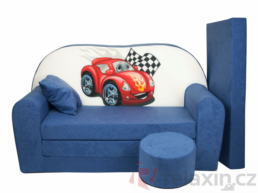 - Dětská rozkládací pohovka + taburet Auto modrá