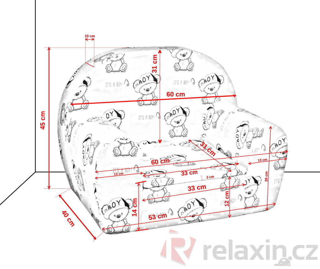 Rozměr křesílka 60x40x45 cm. Výška sedací plochy 15 cm.Praktické dětské křesílko, které Vaše dítě může využít ke hraní, koukání na TV nebo kreslení.