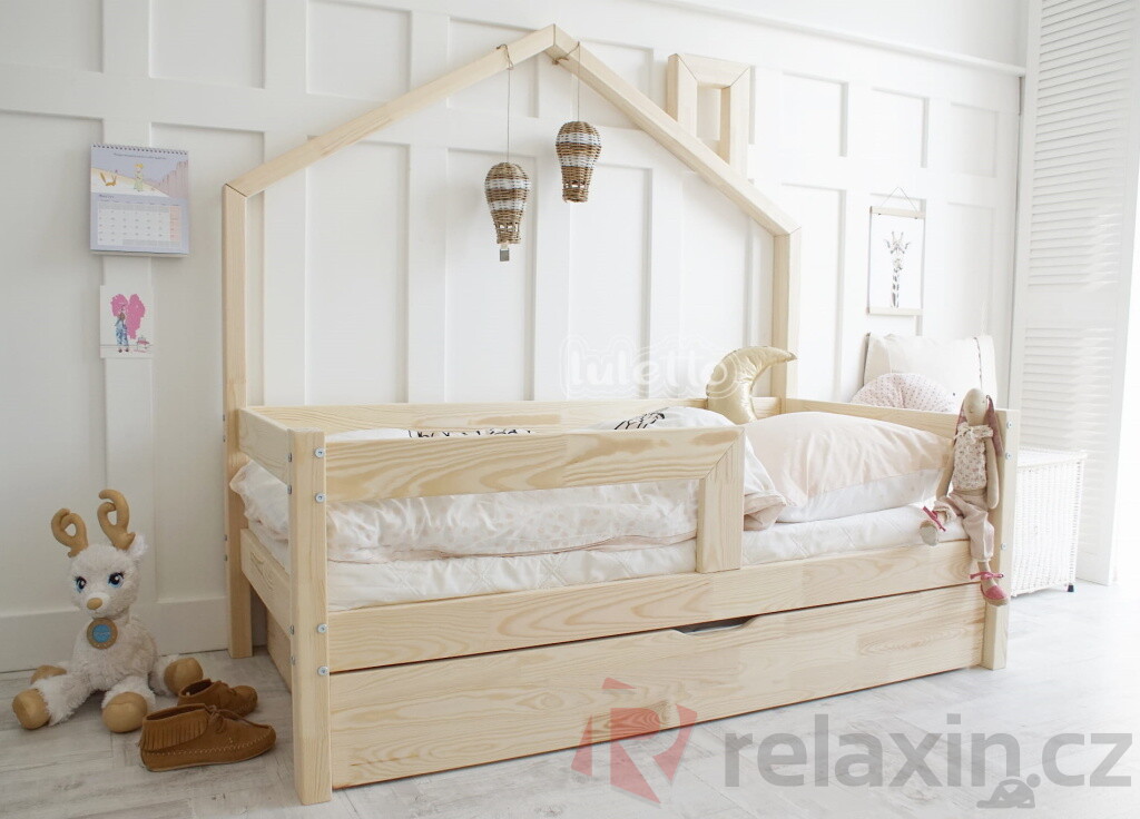 Domečková postel Bali Prosta Plus je vyrobena z lepeného borovicového dřeva 1.třídy, jenž je mnohem odolnější než klasický masiv, nepraská a nemá viditelné suky. Všechny části postele jsou zaoblené, čímž se zvyšuje její celková bezpečnost. Postel je standardně vybavena přední zábrankou do 1/2 délky postele. Zábranka je odnímatelná, v případě potřeby ji lze snadno demontovat. Součástí domečkové postele je také úložný prostor v podobě dvou výsuvných šuplíků. Šuplíky je možné nahradit výsuvnou přistýlkou s roštem, která poskytne lůžko navíc dalšímu dítěti či kamarádům. Tuto rozkládací funkci si můžete zvolit níže v bodě č. 3 "Funkce".
