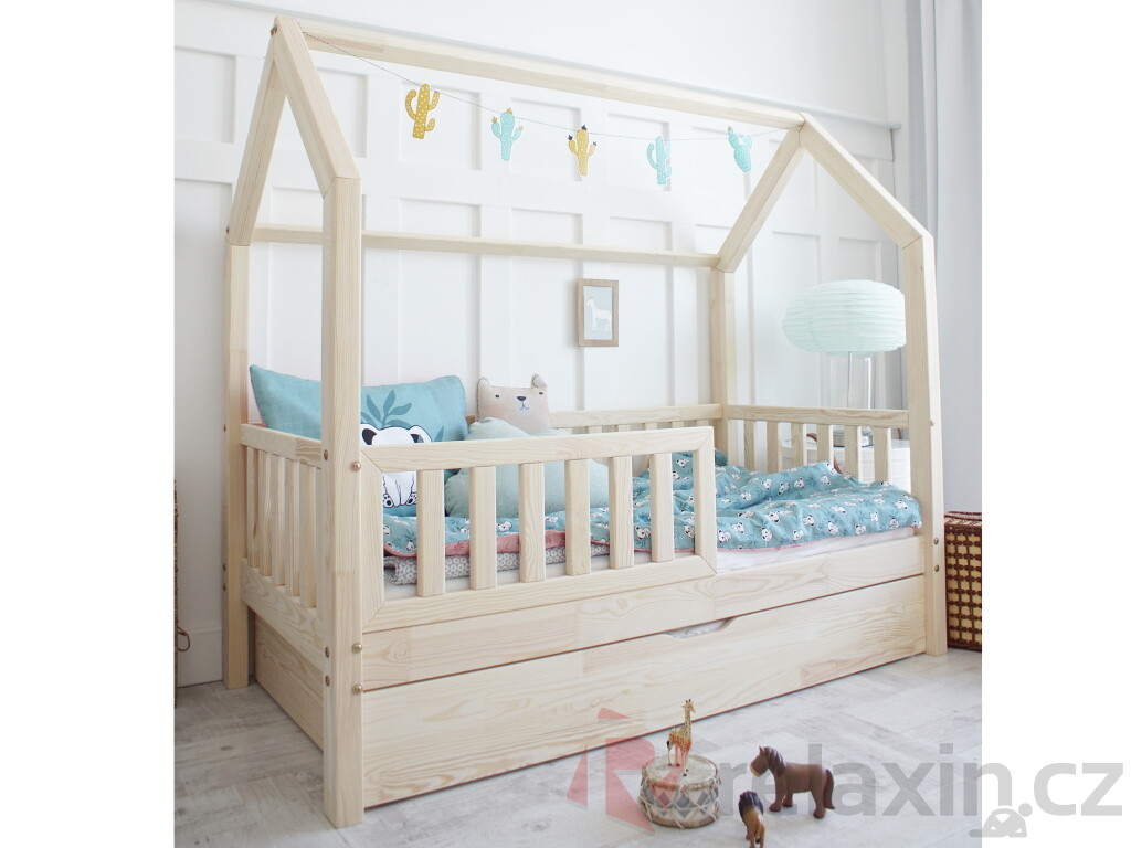 Domečková postel Mali Plus s možností úložného prostoru nebo výsuvné přistýlky. Postel domek Mali Plus v originálním designu s přední zábrankou....