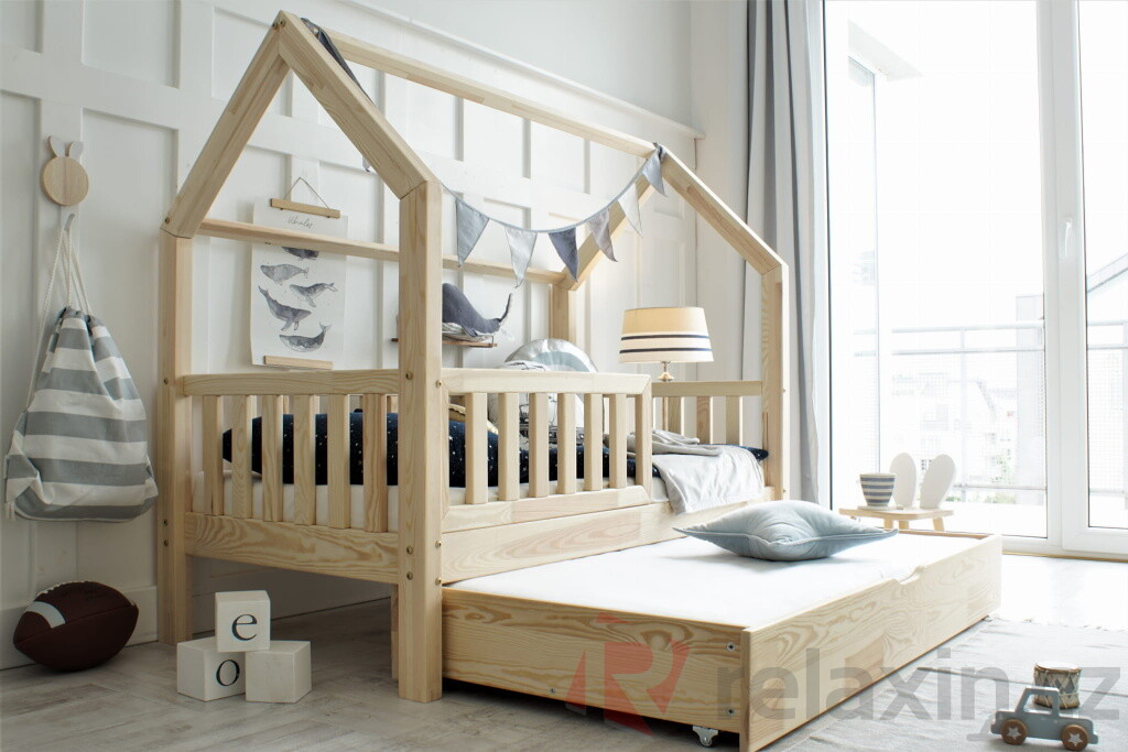 Domečková postel Bianco Plus je vyrobena z lepeného borovicového dřeva 1.třídy, jenž je mnohem odolnější než klasický masiv, nepraská a nemá viditelné suky. Všechny části postele jsou zaoblené, čímž se zvyšuje její celková bezpečnost. Postel je standardně vybavena přední zábrankou do 1/2 délky postele. Tato zábrana je odnímatelná, v případě potřeby ji lze snadno demontovat. Součástí domečkové postele je také úložný prostor v podobě dvou výsuvných šuplíků. Šuplíky je možné nahradit výsuvnou přistýlkou s roštem, která poskytne lůžko navíc dalšímu dítěti či kamarádům. Tuto rozkládací funkci si můžete zvolit níže v bodě č. 3 "Funkce".