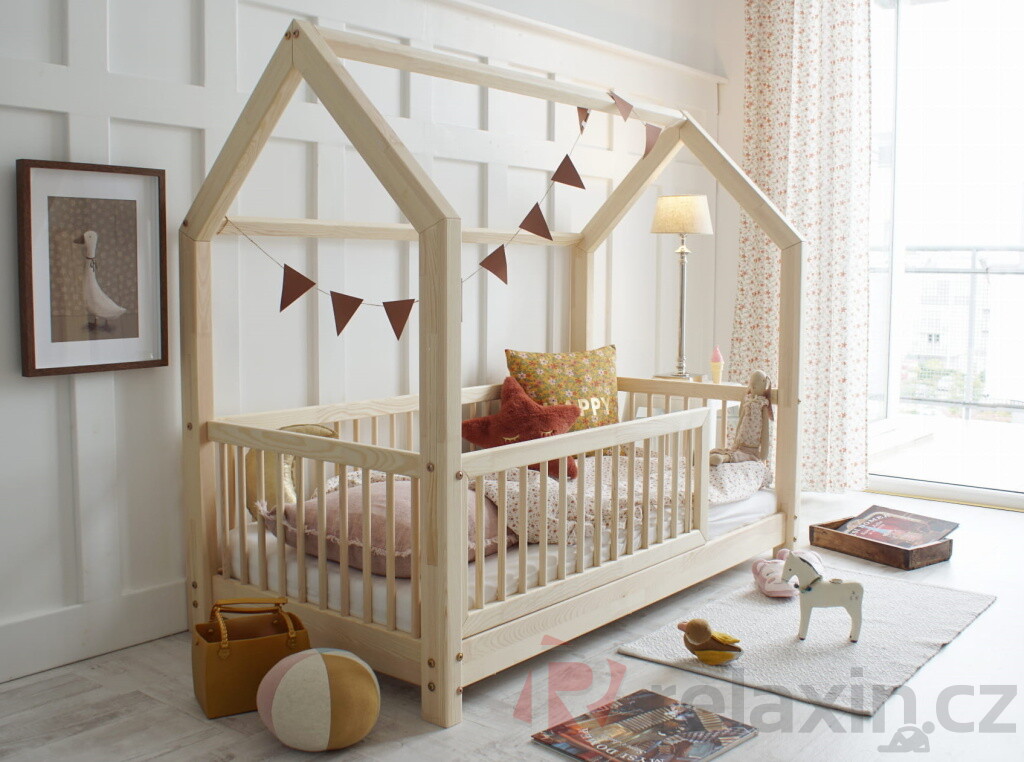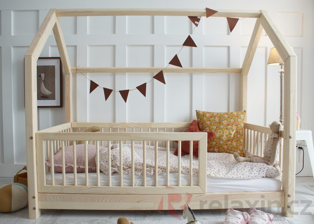 Domečková postel Flori v originálním designu s přední zábrankou a volitelnou výškou nožiček. Postel je dále možné volit v několika rozměrových variantách a barevných provedení. Součástí postele je dřevěný rošt.