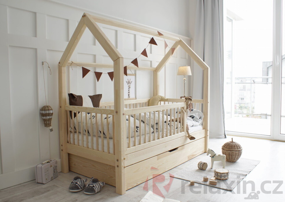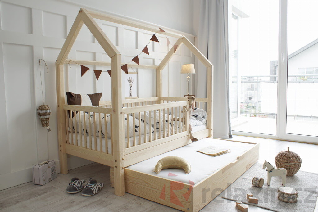 Domečková postel Flori Plus je vyrobena z lepeného borovicového dřeva 1.třídy, jenž je mnohem odolnější než klasický masiv, nepraská a nemá viditelné suky. Všechny části postele jsou zaoblené, čímž se zvyšuje její celková bezpečnost. Postel je standardně vybavena přední zábrankou do 2/3 délky postele. Zábranka je odnímatelná, v případě potřeby ji lze snadno demontovat. Součástí domečkové postele je také úložný prostor v podobě dvou výsuvných šuplíků. Šuplíky je možné nahradit výsuvnou přistýlkou s roštem, která poskytne lůžko navíc dalšímu dítěti či kamarádům. Tuto rozkládací funkci si můžete zvolit níže v bodě č. 3 "Funkce".