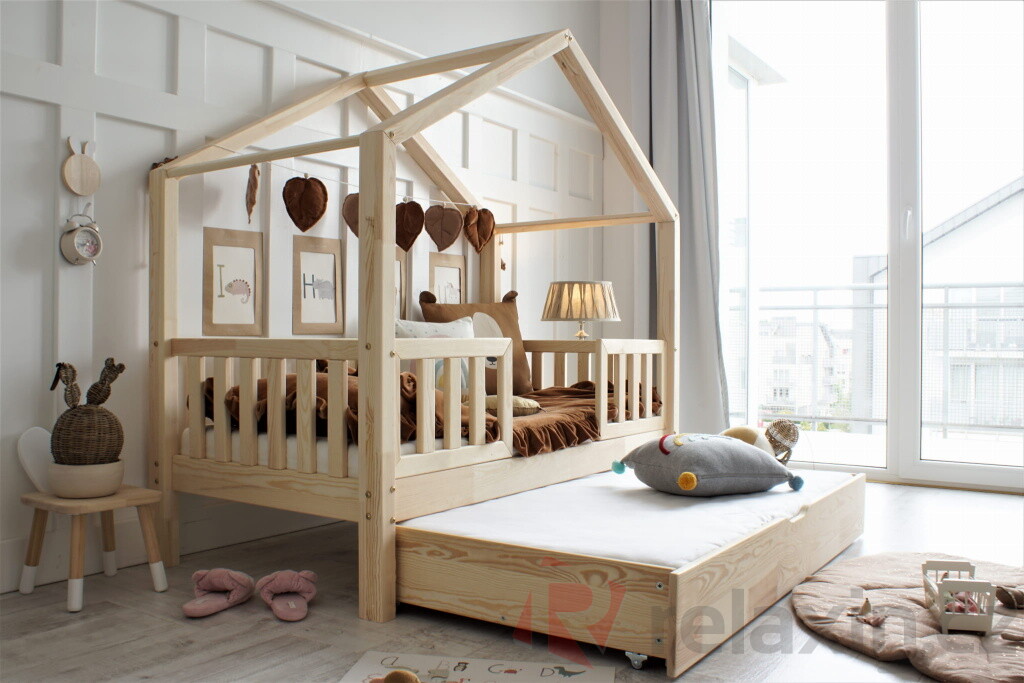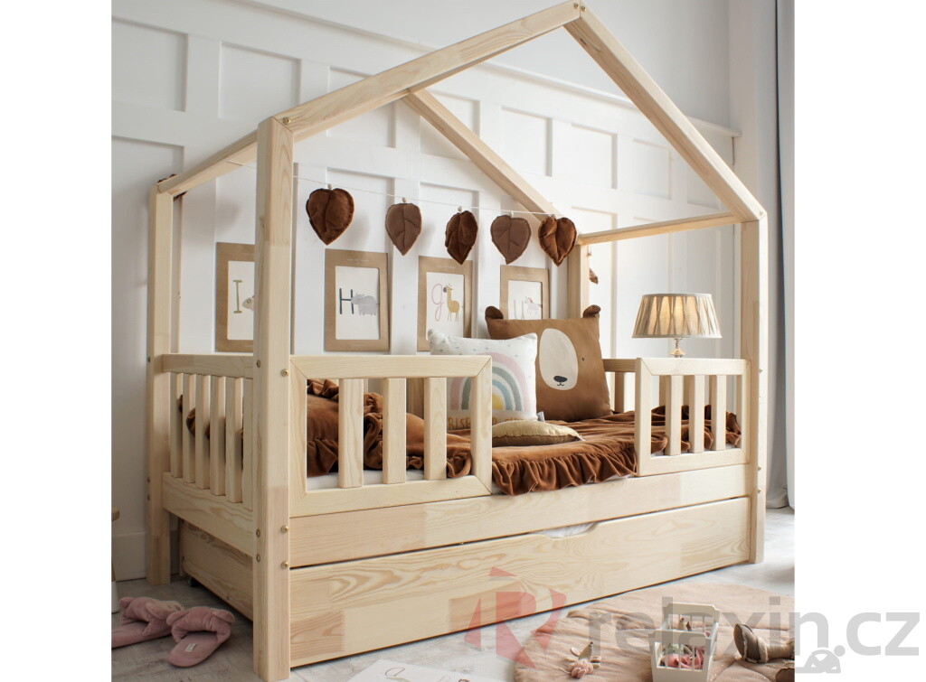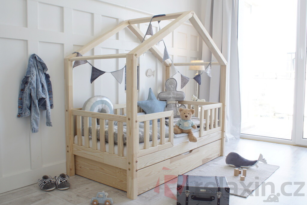 Domečková postel HouseBed Plotek Duo Plus je vyrobena z lepeného borovicového dřeva 1.třídy, jenž je mnohem odolnější než klasický masiv, nepraská a nemá viditelné suky. Všechny části postele jsou zaoblené, čímž se zvyšuje její celková bezpečnost. Postel je standardně vybavena dvěma předními zábrankami do 1/3 délky postele - tedy celkem do 2/3 její délky se vstupem uprostřed. Zábranky jsou odnímatelné, v případě potřeby je lze snadno demontovat. Součástí domečkové postele je také úložný prostor v podobě dvou výsuvných šuplíků. Šuplíky je možné nahradit výsuvnou přistýlkou s roštem, která poskytne lůžko navíc dalšímu dítěti či kamarádům. Tuto rozkládací funkci si můžete zvolit níže v bodě č. 3 "Funkce".