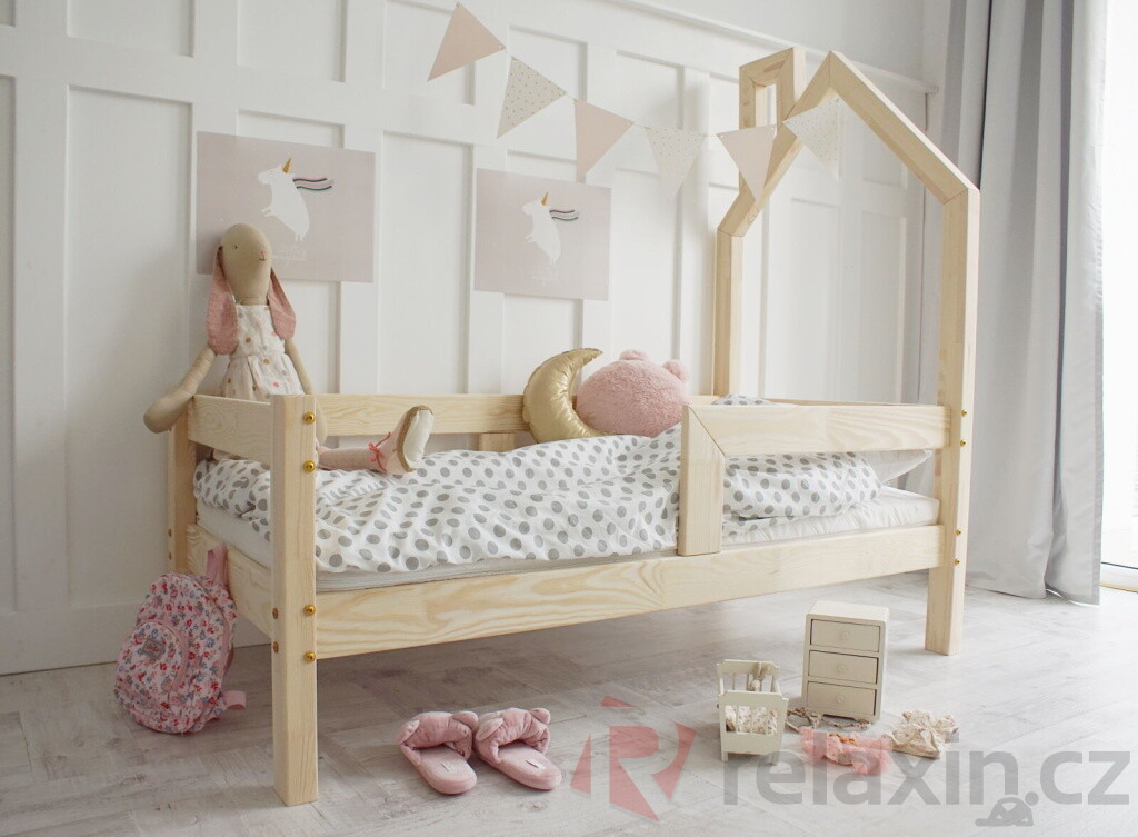 Domečková postel Mali Prosta v originálním designu s přední zábrankou a volitelnou výškou nožiček. Postel je dále možné volit v několika rozměrových variantách a barevných provedení. Součástí postele je dřevěný rošt.