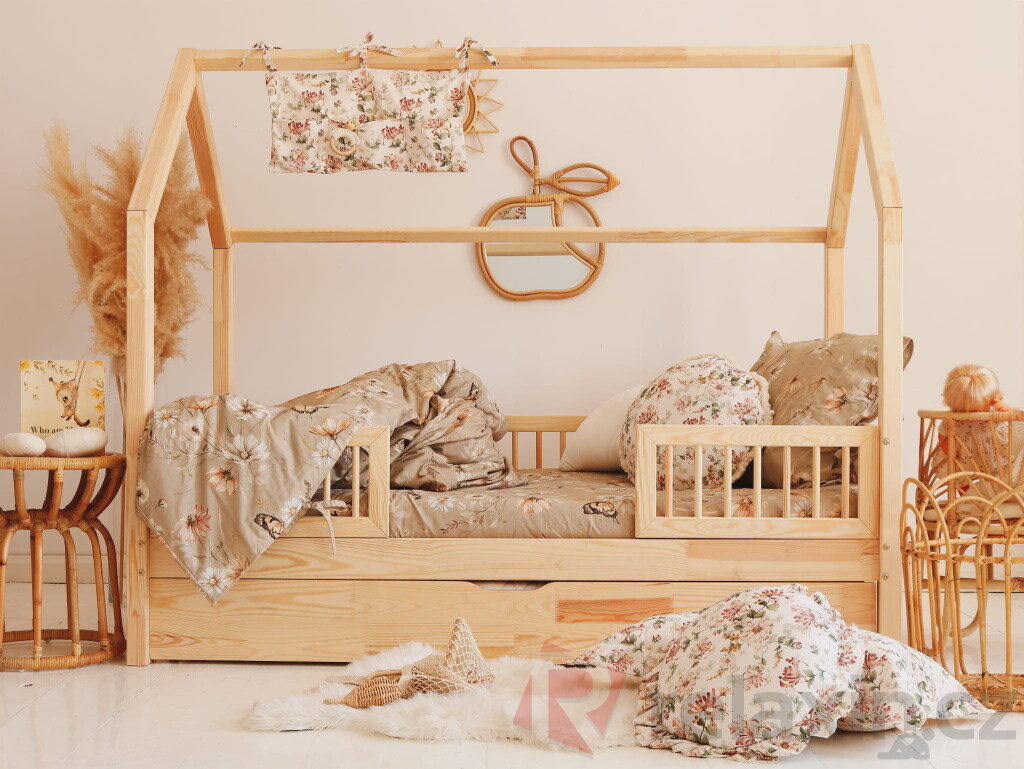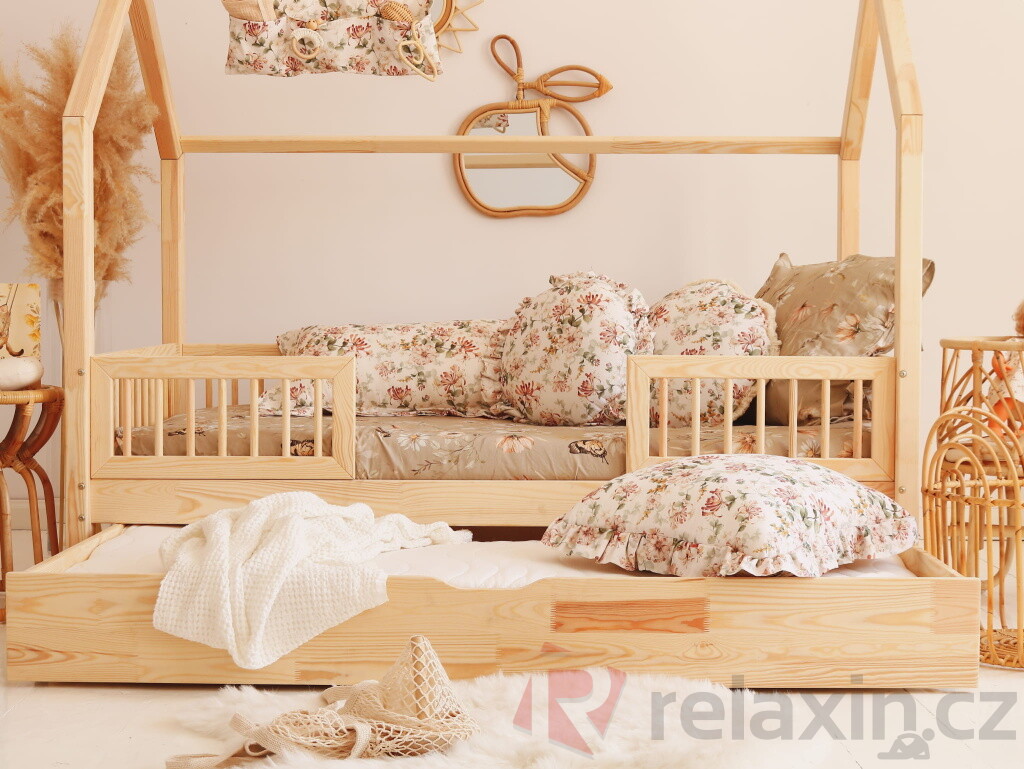 Domečková postel Flori Plus s možností úložného prostoru nebo výsuvné přistýlky. Postel domek Flori Plus v originálním designu s přední zábrankou....