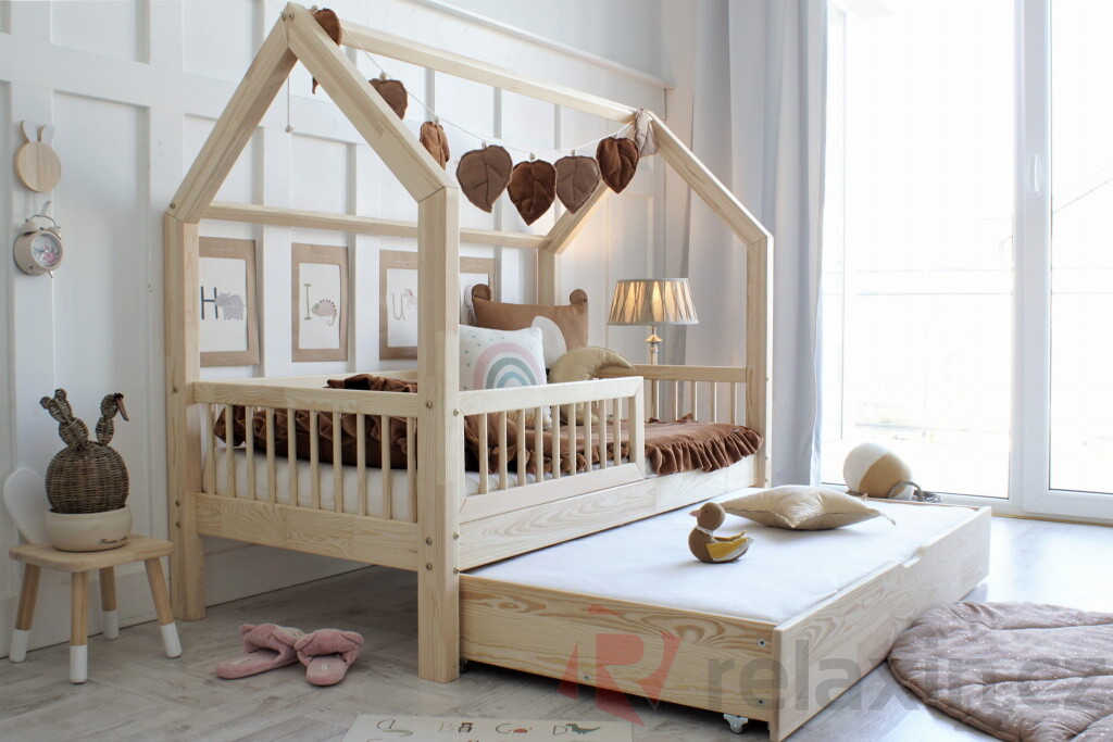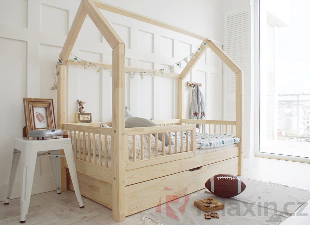 Domečková postel Pioli Plus je vyrobena z lepeného borovicového dřeva 1.třídy, jenž je mnohem odolnější než klasický masiv, nepraská a nemá viditelné suky. Všechny části postele jsou zaoblené, čímž se zvyšuje její celková bezpečnost. Postel je standardně vybavena přední zábrankou do 1/2 délky postele. Zábranka je odnímatelná, v případě potřeby ji lze snadno demontovat. Součástí domečkové postele je také úložný prostor v podobě dvou výsuvných šuplíků. Šuplíky je možné nahradit výsuvnou přistýlkou s roštem, která poskytne lůžko navíc dalšímu dítěti či kamarádům. Tuto rozkládací funkci si můžete zvolit níže v bodě č. 3 "Funkce".