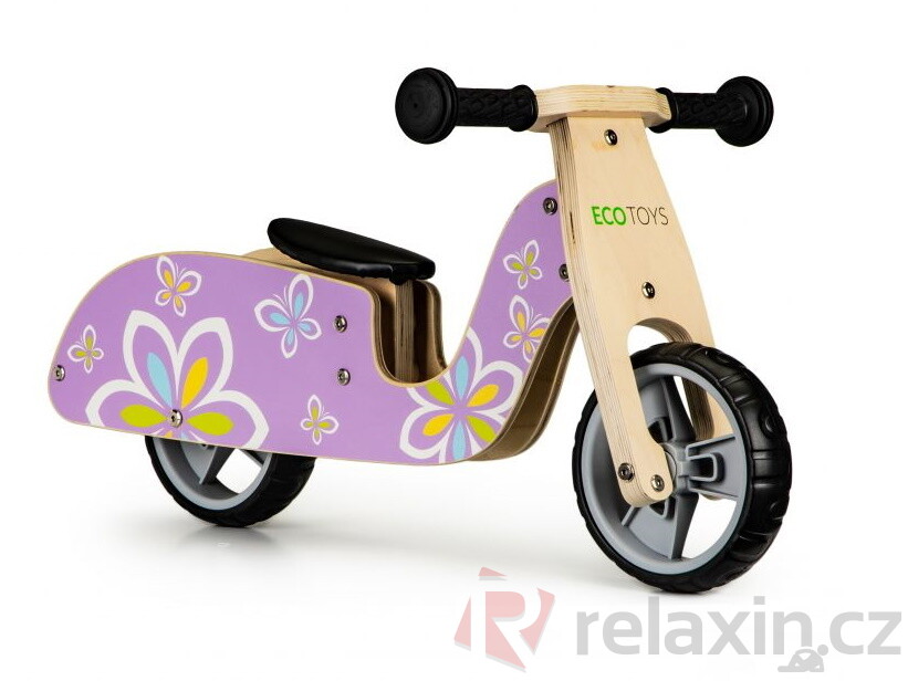 Dřevěné odrážedlo s nastavitelnou výškou sedadla. Kola se speciální úpravou - vhodné pro jízdu doma i venku. Maximální nosnost 20 kg.