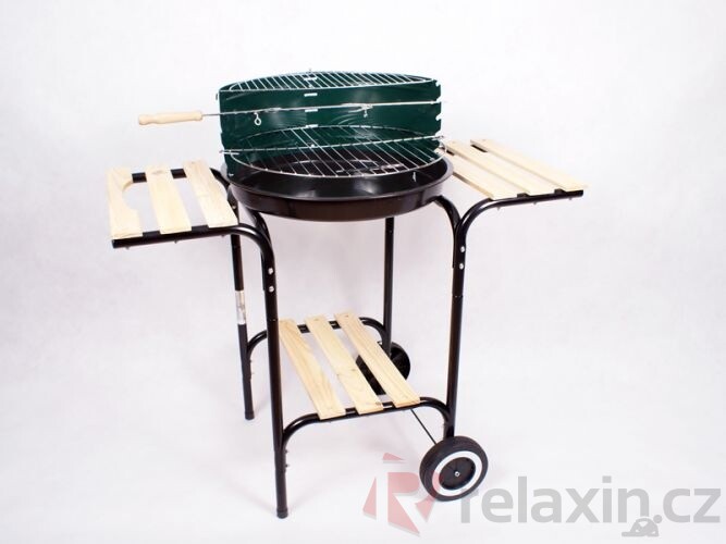 Gril na dřevěné uhlí Round 46 cm s odkládací plochou, výškově nastavitelným roštem, otočnou vidlicí a kolečky. Průměr roštu 42 cm.