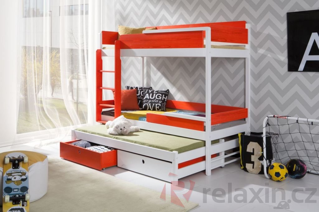Patrová postel - trojlůžko je vhodná do dětských a studentských pokojů pro dvě nebo tři děti. Největší výhodou je úspora místa, kdy rodiny s dvěma/třemi dětmi nemají prostor na dvě/tři jednolůžkové postele nebo chtějí v dětském pokoji ušetřit místo na další nábytek či doplňky. Výsuvné třetí lůžko může také posloužit k přespání kamarádů nebo návštěv. Další výhodou postele je možnost dokoupení dětské zábrankyu dolního lůžka, která brání vypadnutí dítěte, čímž zajišťuje bezpečí i těm nejmenším. Tato patrová postel - trojlůžko s úložným prostorem se vyrábí v rozměrech 80x180 cm, 80x200 cm pro děti zhruba školního věku a pro studenty nebo klasická velikost jednolůžka 90x200 cm.