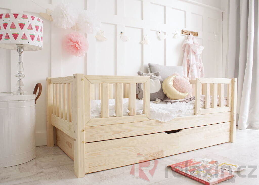 Postel Basic Love Duo Plus je vyrobena z lepeného borovicového dřeva 1.třídy, jenž je mnohem odolnější než klasický masiv, nepraská a nemá viditelné suky. Všechny části postele jsou zaoblené, čímž se zvyšuje její celková bezpečnost. Postel je standardně vybavena předními zábranami do 1/3 délky - tedy 2/3 celkové délky postele se vstupem uprostřed. Součástí postele je také úložný prostor v podobě dvou výsuvných šuplíků. Šuplíky je možné nahradit výsuvnou přistýlkou s roštem, která poskytne lůžko navíc dalšímu dítěti či kamarádům. Tuto rozkládací funkci si můžete zvolit níže v bodě č. 3 "Funkce".
