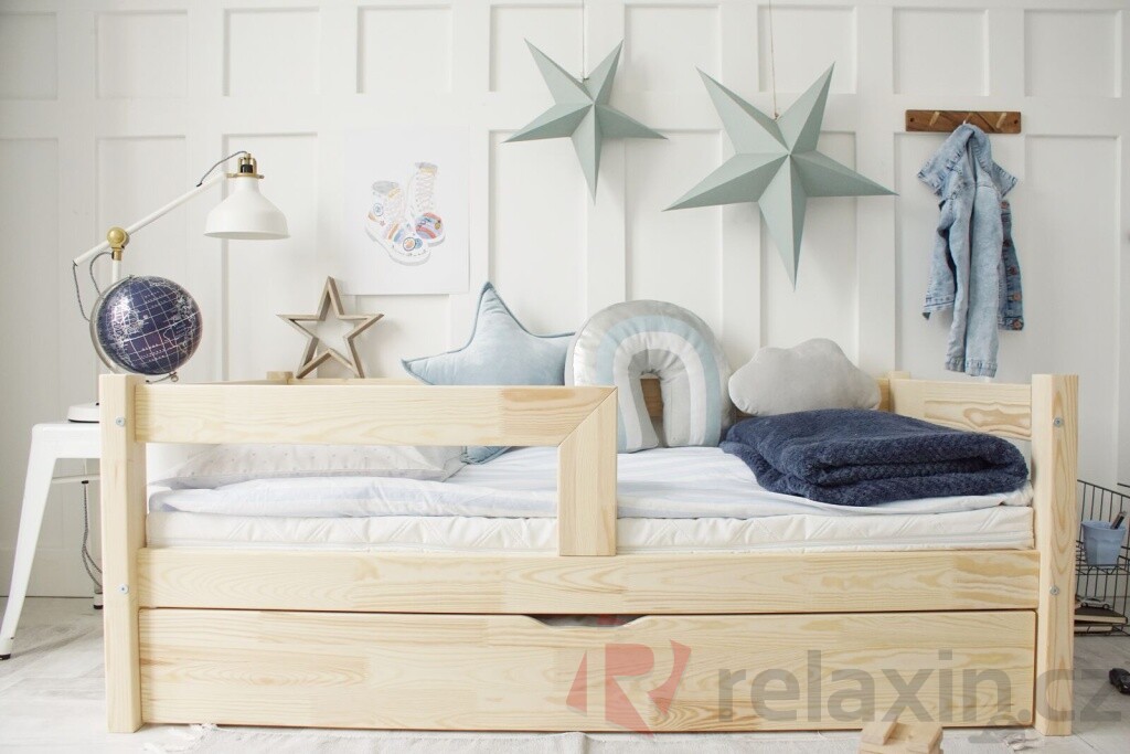 Postel Basic Prosta Plus je vyrobena z lepeného borovicového dřeva 1.třídy, jenž je mnohem odolnější než klasický masiv, nepraská a nemá viditelné suky. Všechny části postele jsou zaoblené, čímž se zvyšuje její celková bezpečnost. Postel je standardně vybavena přední zábranou do 1/2 délky postele. Součástí postele je také úložný prostor v podobě dvou výsuvných šuplíků. Šuplíky je možné nahradit výsuvnou přistýlkou s roštem, která poskytne lůžko navíc dalšímu dítěti či kamarádům. Tuto rozkládací funkci si můžete zvolit níže v bodě č. 3 "Funkce".