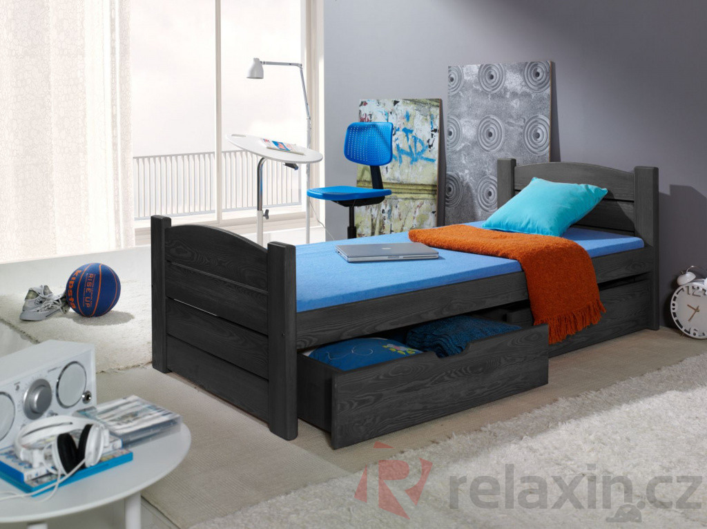 Vyobrazená barva postele: grafit. Postel z borovicového masivu s úložnými prostory v podobě výsuvných šuplíků, které lze využít k uskladnění lůžkovin či dalších věcí. Maximální doporučené zatížení postele je 120kg/postel.