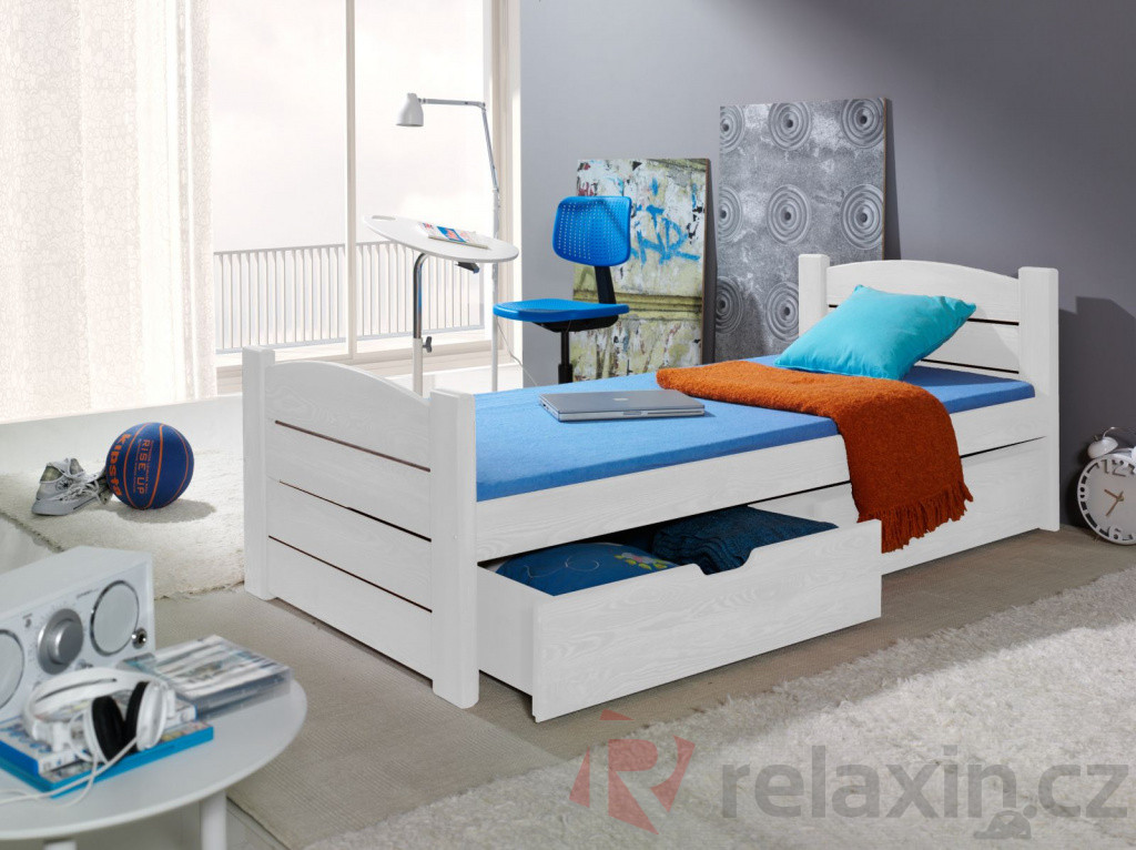 Úložný prostor postele je řešený výsuvnými šuplíky. Tato postel je vhodná do dětských a studentských pokojů. Dětské postele v rozměrech 60x120 cm pro nejmenší, 70x160 cm pro větší děti. Tato postel s úložným prostorem se vyrábí i v klasických rozměrech pro dospělé 80x200 cm a 90x200 cm. Mezi přednosti postele patří variabilnost - můžete si zvolit barvu jak celé postele, tak i doplňků jako jsou výsuvné šuplíky a sladit tak postel s interiérem např. dětského pokoje.