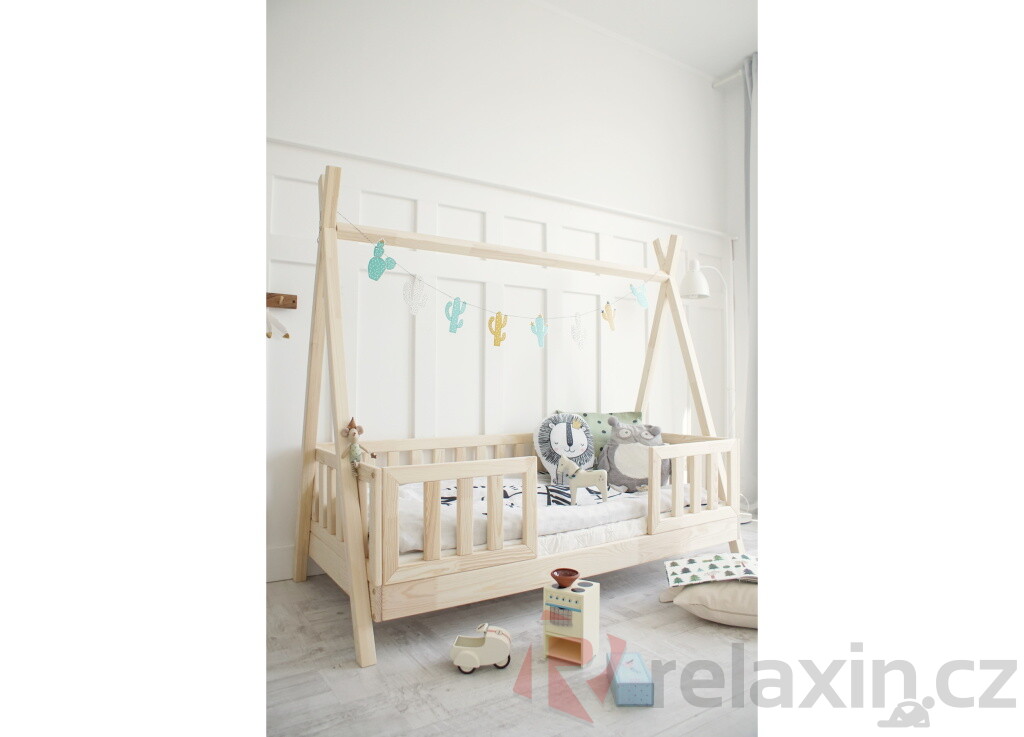 Postel Tipi Duo je vyrobena z lepeného borovicového dřeva 1.třídy, jenž je mnohem odolnější než klasický masiv, nepraská a nemá viditelné suky. Její nevšední nadčasový tvar Tipi / Teepee umožní dětem postel různě ozdobit nebo zavěsit třeba lampičku. Postel je standardně vybavena předními zábrankami do 1/3 délky postele - tedy do 2/3 její celkové délky se vstupem uprostřed. Tyto zábrany jsou odnímatelné, v případě potřeby je tak lze snadno demontovat. Výšku nožiček je možno volit ve dvou výškách - 10 cm nebo 19 cm. Volitelné je také barevné provedení v 6 možných variantách.