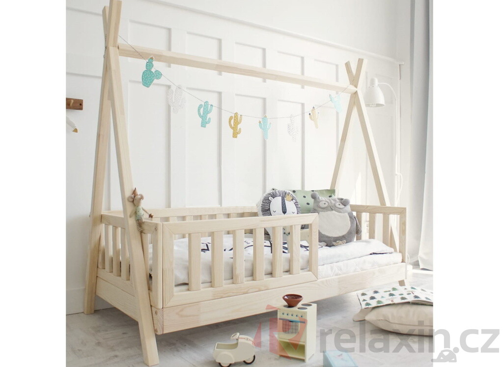 Postel Tipi Plotek je vyrobena z lepeného borovicového dřeva 1.třídy, jenž je mnohem odolnější než klasický masiv, nepraská a nemá viditelné suky. Její nevšední nadčasový tvar Tipi / Teepee umožní dětem postel různě ozdobit nebo zavěsit třeba lampičku. Postel je standardně vybavena přední zábrankou do 1/2 délky postele. Tato zábrana je odnímatelné, v případě potřeby ji lze snadno demontovat. Výšku nožiček je možno volit ve dvou výškách - 10 cm nebo 19 cm. Volitelné je také barevné provedení v 7 možných variantách.