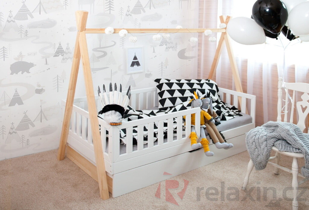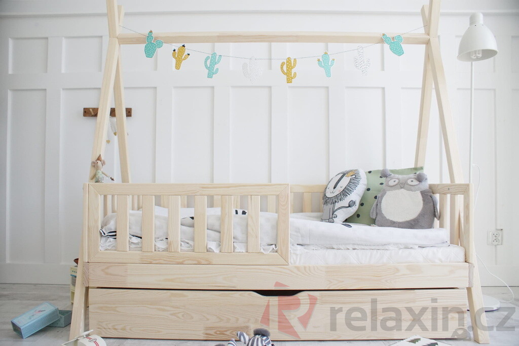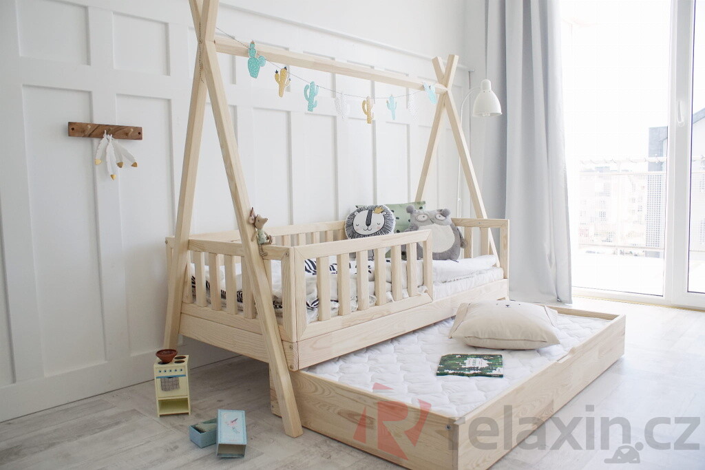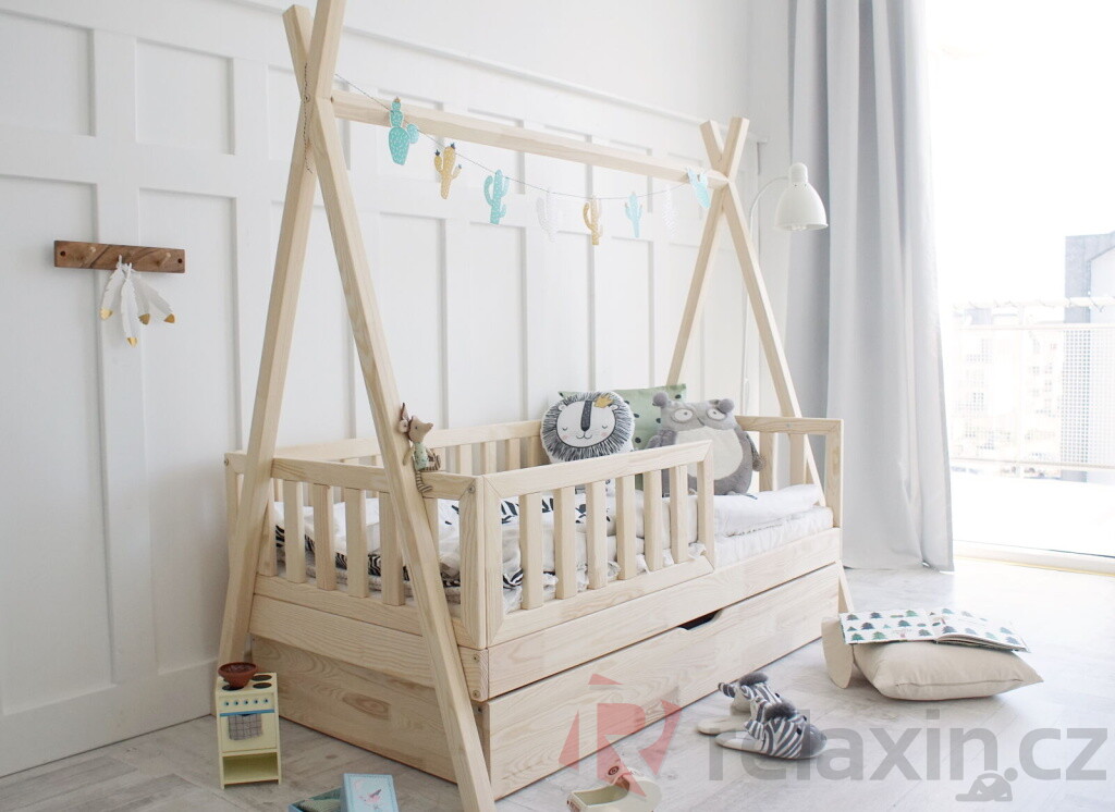 Postel Tipi Plotek Plus je vyrobena z lepeného borovicového dřeva 1.třídy, jenž je mnohem odolnější než klasický masiv, nepraská a nemá viditelné suky. Její nevšední nadčasový tvar Tipi / Teepee umožní dětem postel různě ozdobit nebo zavěsit třeba lampičku. Všechny části postele jsou zaoblené, čímž se zvyšuje její celková bezpečnost. Postel je standardně vybavena přední zábrankou do 1/2 postele. Zábrana je odnímatelná, v případě potřeby ji lze demontovat. Součástí postele je také úložný prostor v podobě dvou výsuvných šuplíků. Šuplíky je možné nahradit výsuvnou přistýlkou s roštem, která poskytne lůžko navíc dalšímu dítěti či kamarádům. Tuto rozkládací funkci si můžete zvolit níže v bodě č. 3 "Funkce".