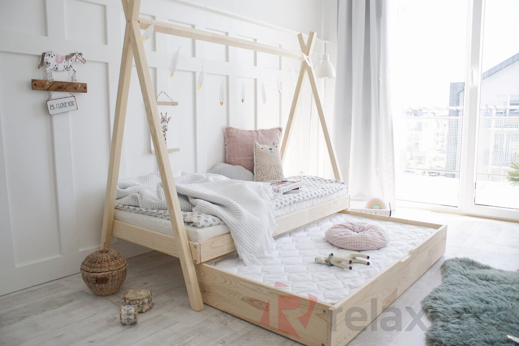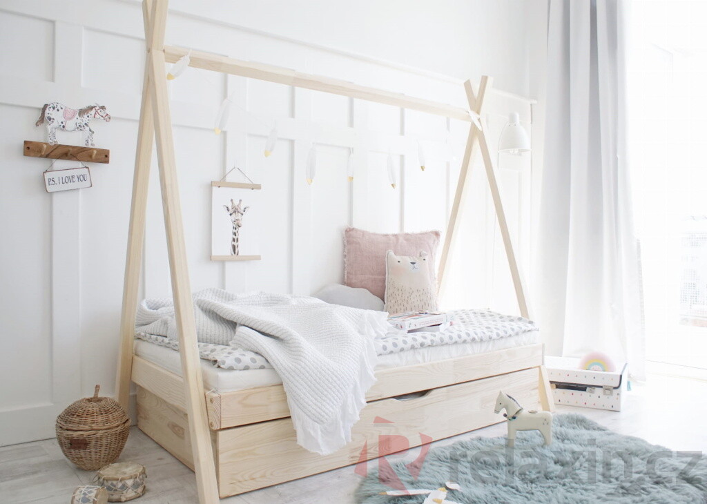 Postel Tipi Plus je vyrobena z lepeného borovicového dřeva 1.třídy, jenž je mnohem odolnější než klasický masiv, nepraská a nemá viditelné suky. Její nevšední nadčasový tvar Tipi / Teepee umožní dětem postel různě ozdobit nebo zavěsit třeba lampičku. Vzhledem k absenci postranních bočnic je postel vhodná pro děti, které se již bez těchto zábran obejdou (v nabídce naleznete také variantu postele Tipi se zábrankami). Součástí postele je také úložný prostor v podobě dvou výsuvných šuplíků. Šuplíky je možné nahradit výsuvnou přistýlkou s roštem, která poskytne lůžko navíc dalšímu dítěti či kamarádům. Tuto rozkládací funkci si můžete zvolit níže v bodě č. 3 "Funkce".