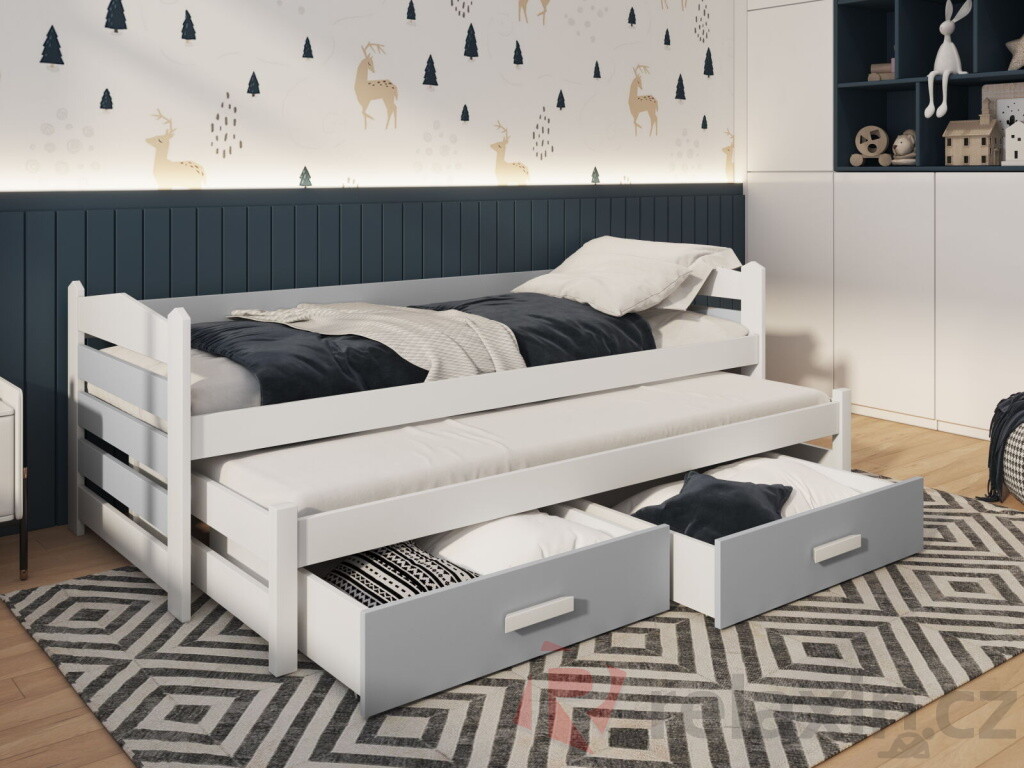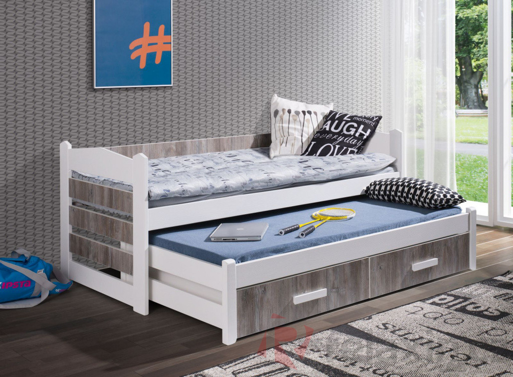 Vyobrazená varianta postele: bílý akryl / šedé PVC. Rozkládací postel s výsuvným druhým lůžkem z lakovaného borovicového masivu. Postel má úložné prostory v podobě výsuvných šuplíků, které lze využít k uskladnění lůžkovin či dalších věcí. Maximální doporučené zatížení hlavního lůžka je 120 kg a 100 kg pro výsuvné lůžko.