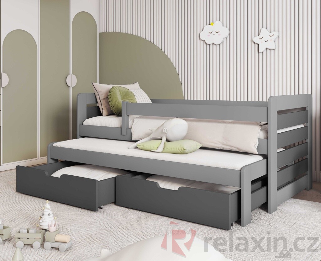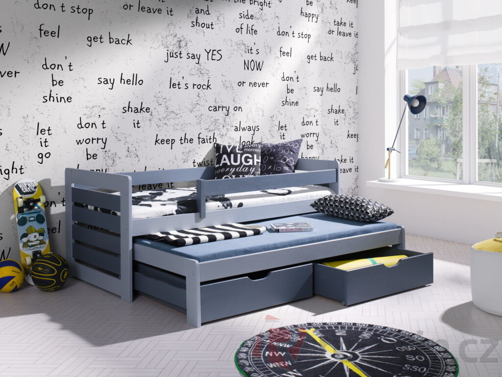 Vyobrazená barva postele: šedý akryl, grafit akryl, se zábrankou. Rozkládací postel s výsuvným druhým lůžkem z lakovaného borovicového masivu. Postel má úložné prostory v podobě výsuvných šuplíků, které lze využít k uskladnění lůžkovin či dalších věcí. Maximální doporučené zatížení hlavního lůžka je 120 kg a 100 kg pro výsuvné lůžko.