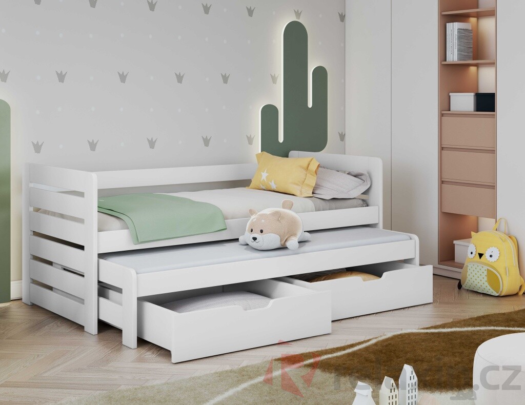 Vyobrazená barva postele: Bílý akryl. Rozkládací postel s výsuvným druhým lůžkem z lakovaného borovicového masivu. Postel má úložné prostory v podobě výsuvných šuplíků, které lze využít k uskladnění lůžkovin či dalších věcí. Maximální doporučené zatížení hlavního lůžka je 120 kg a 100 kg pro výsuvné lůžko.