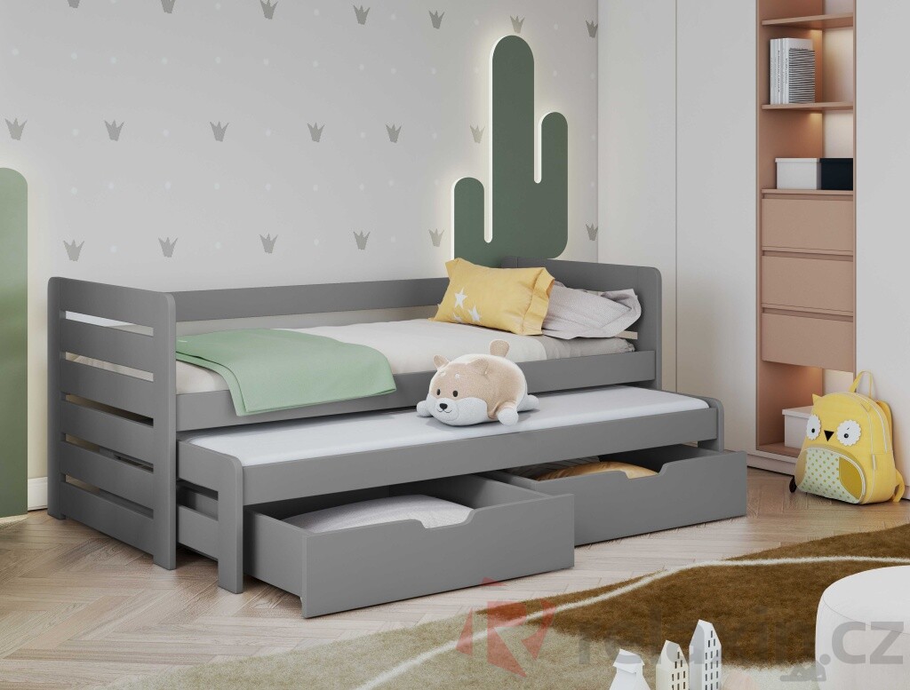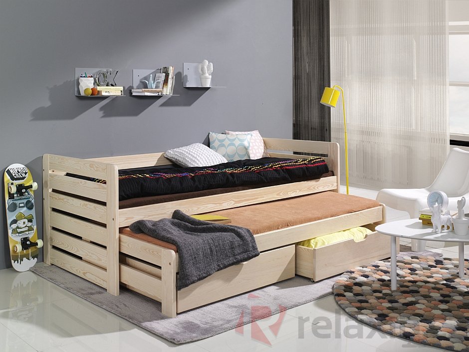 Rozkládací postel Miko vyrobena z borovicového masivu doplněného o komponenty z MDF desek. V ceně postele je 2x lamelový rošt a odnímatelná zábranka.