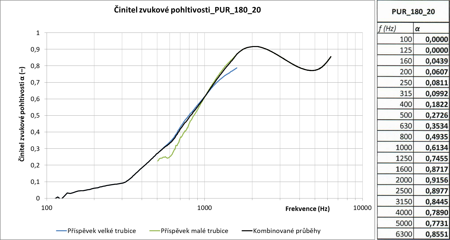 Graf zvukové pohltivosti byl měřen pro objemovou hmostnost 180 kg/m3 o síle 2 cm, od nabízené síly 5 cm se může lišit. Se sílou materiálu se pohltivost zlepšuje. Toto jsou minimální parametry, kterých materiál dosahuje.