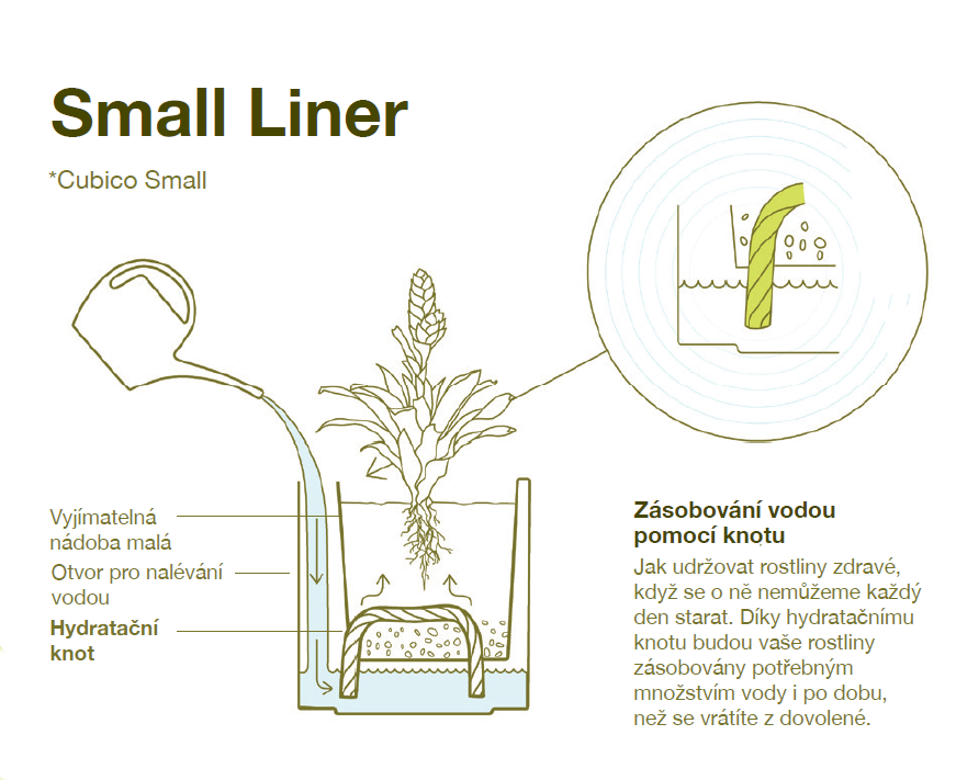 Samozavlažovací květináč Cubico 13 je vybaven samozavlažovacím systémem Small Liner. Toto samozavlažování funguje na principu hydratačních knotů, které přivádí potřebné množství vody přímo rostlině až po několik dní. Součástí květináče je vyjímatelná nádoba s otvorem pro nalévání vody a hydratační knot (tento rozměr nemá hladinoměr). Květináč neobsahuje vypouštěcí ventil, je tedy primárně určen do prostředí interiéru.