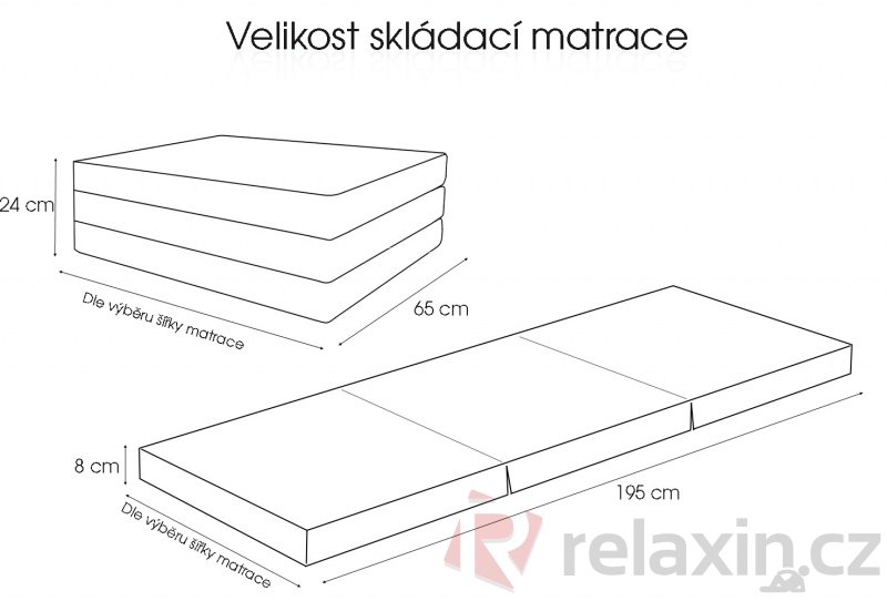 - Rozměr matrace ve složeném stavu: 65 cm x (80, 90, 100, 110, 120, 130, 140, 150, 160) cm x 24 cm